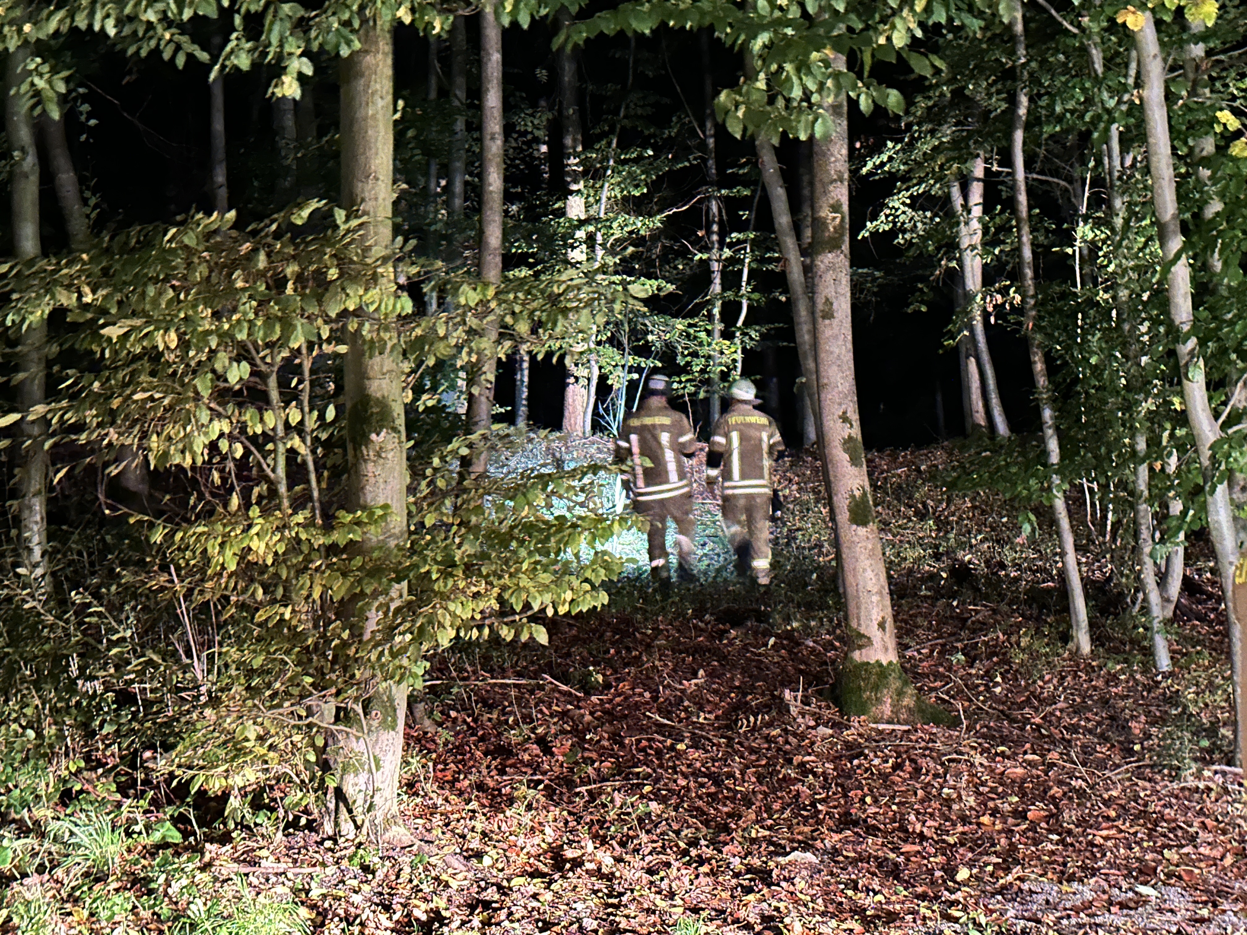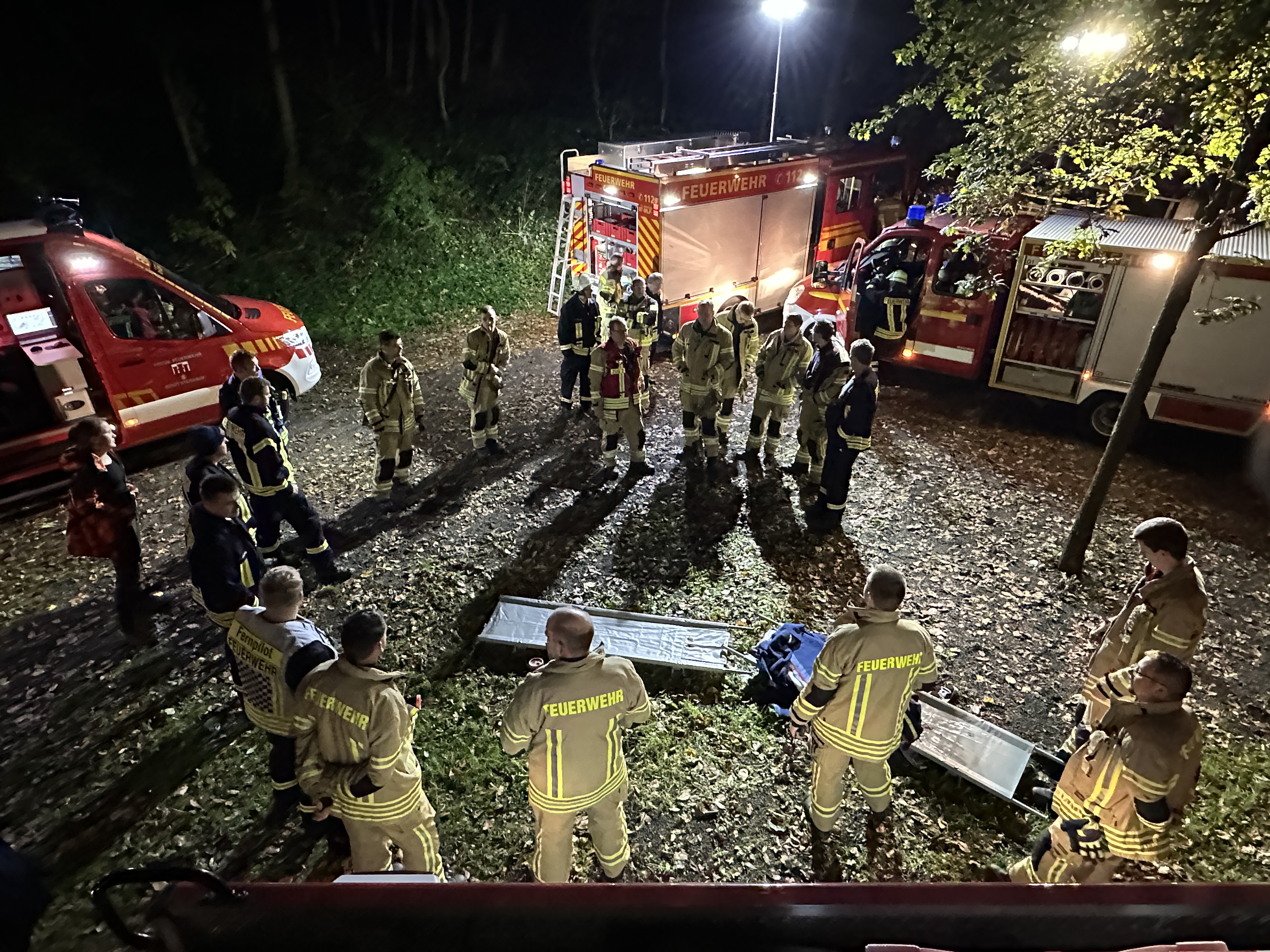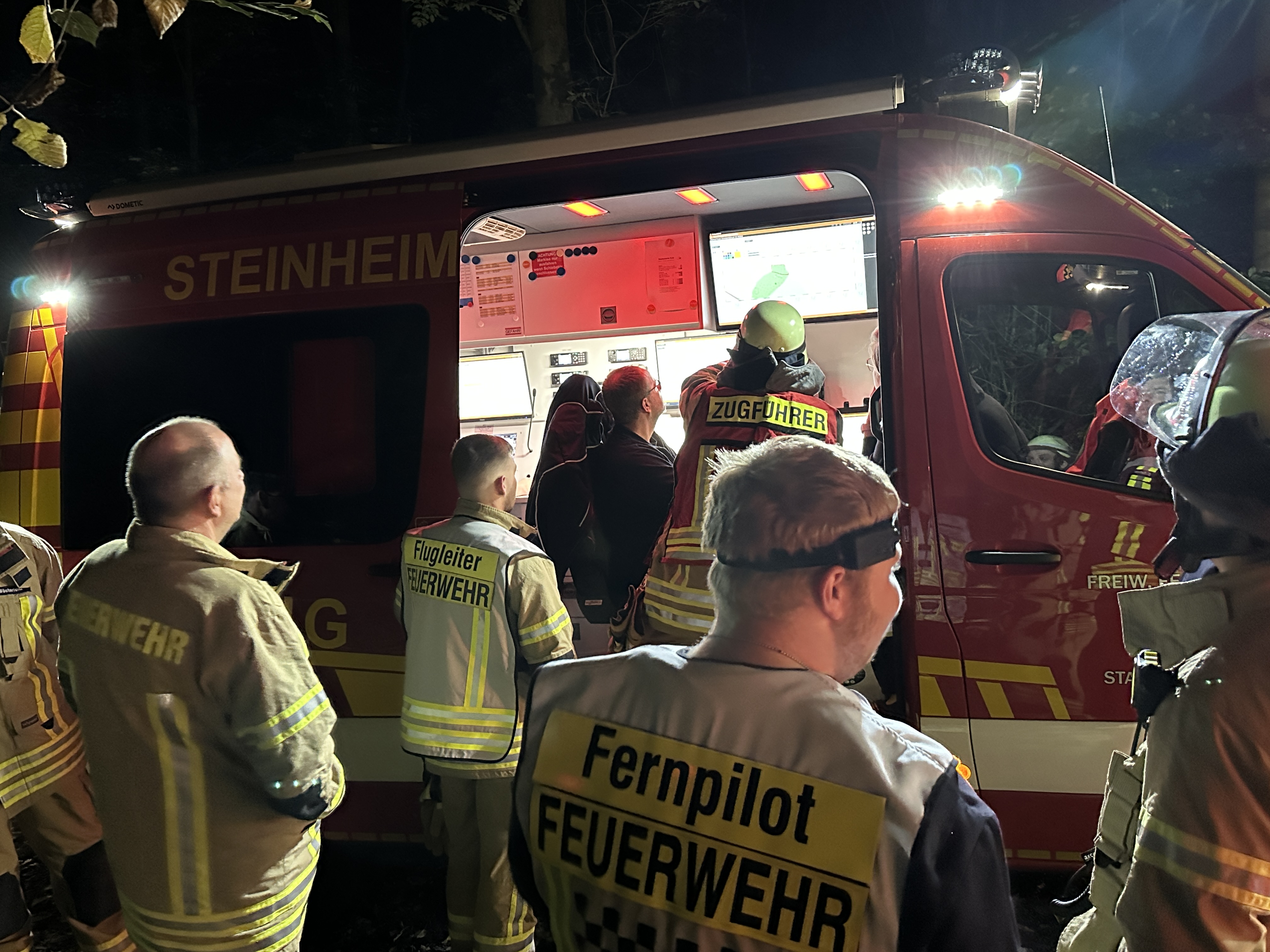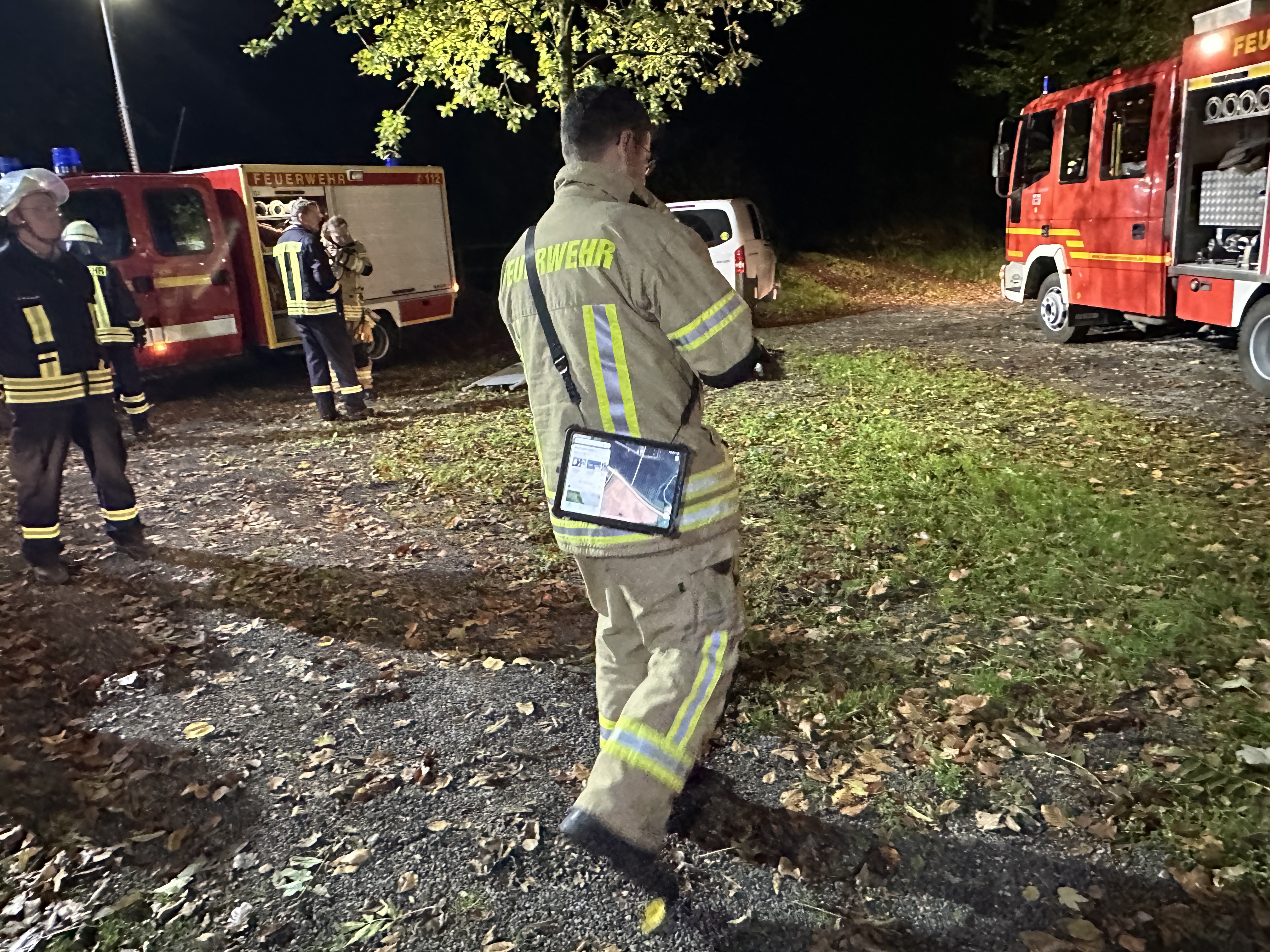 Übungsannahme war die Suche nach einer vermissten Person in unwegsamem Waldgelände. Um eine möglichst realistische Einsatzlage zu simulieren, wurde das Gebiet weitläufig abgesucht. Vier Trupps, ausgestattet mit Wärmebildkameras, begaben sich systematisch auf die Suche. Ergänzend kam die Drohnengruppe der Löschgruppe Bergheim zum Einsatz, um das Gelände aus der Luft zu überblicken und gezielt Hinweise auf den Aufenthaltsort der vermissten Person zu finden.
