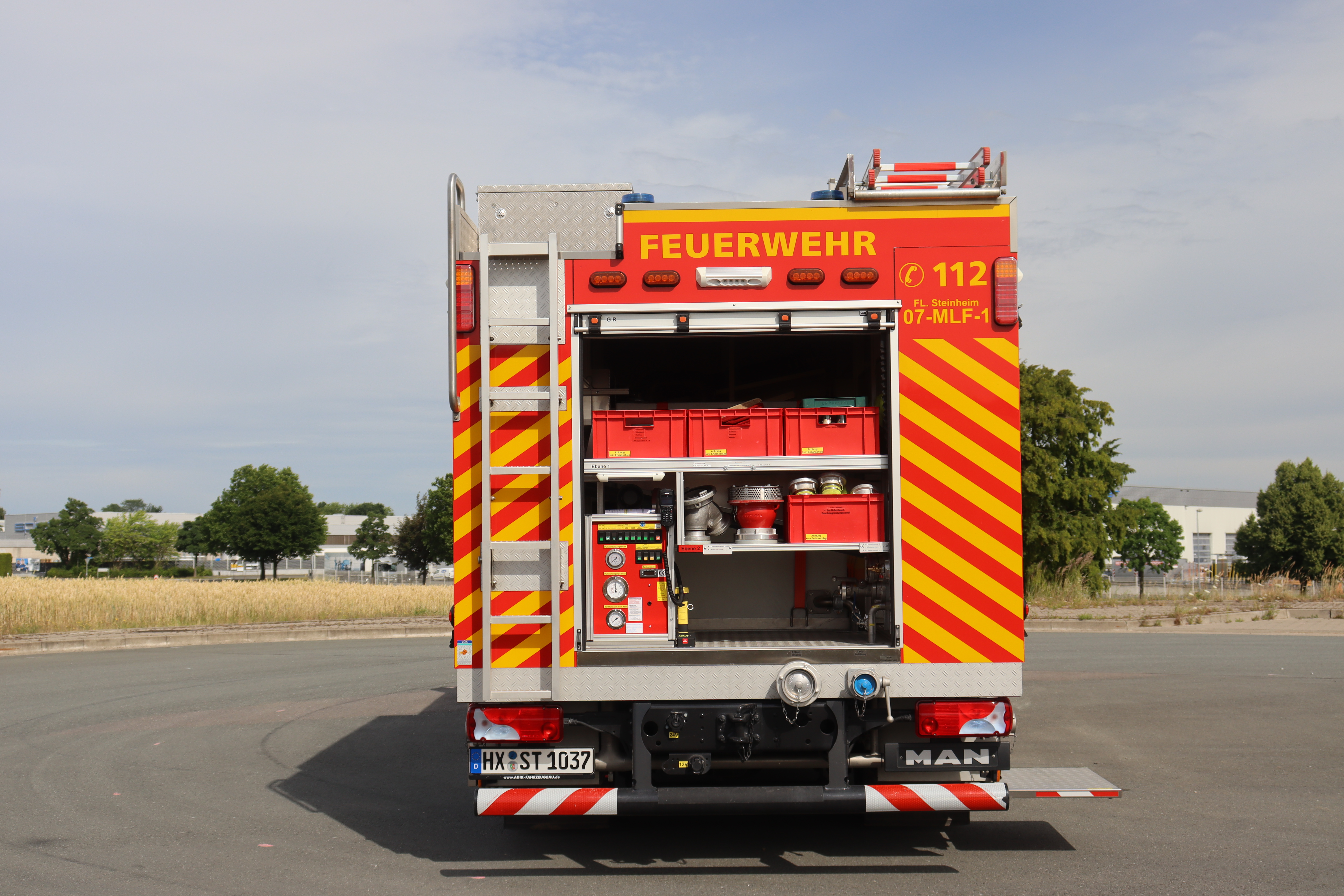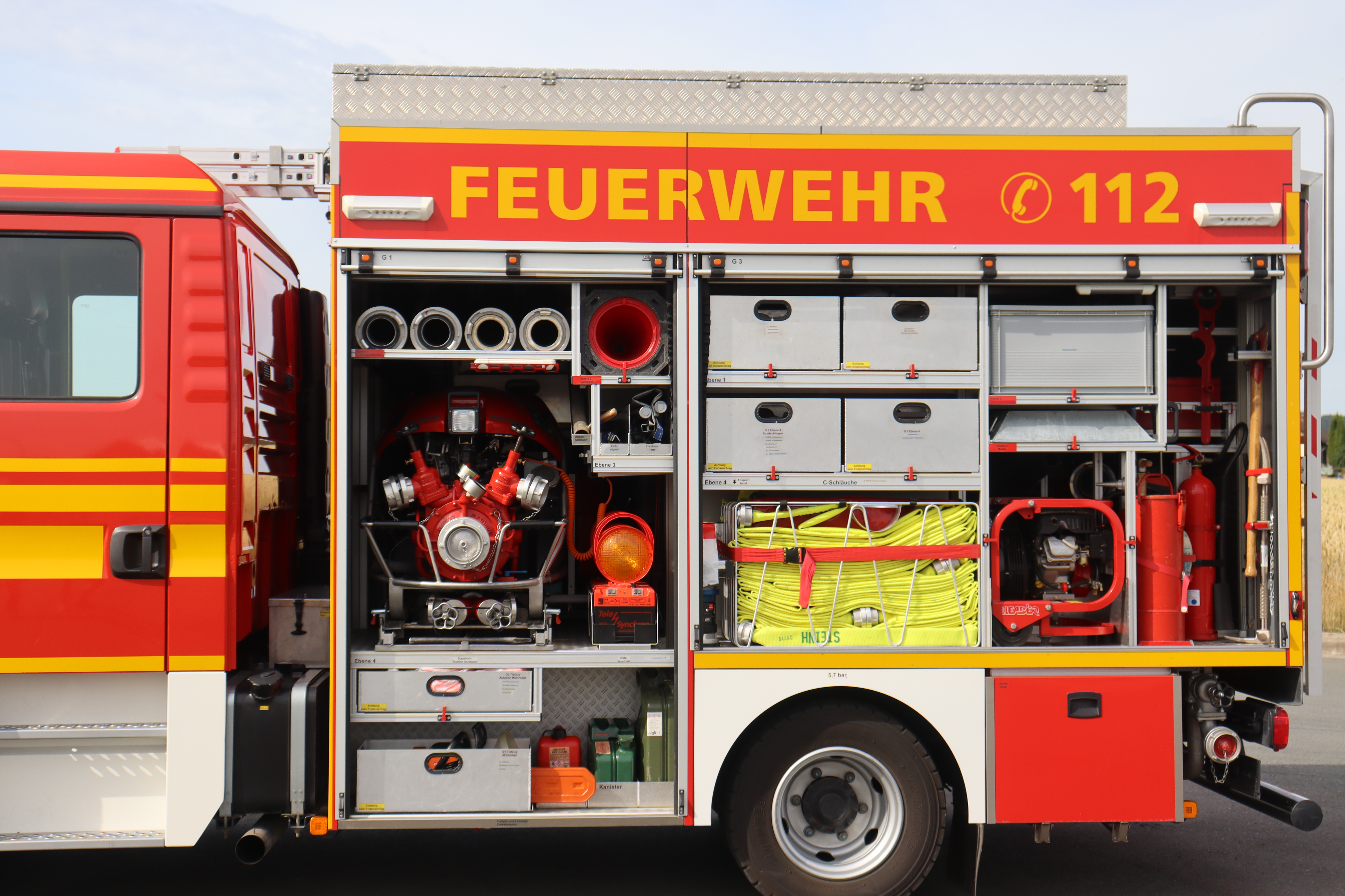 Besondere Beladung: Motorsäge inkl. Schutzkleidung, Wärmebildkamera Flir K2, Tauchpumpe TP 8/1, Schwimmsaugkorb, Umfeldbeleuchtung mit pneumatischen Lichtmast 24V, 2x 1000 Watt Zusatzscheinwerfer, Stromerzeuger 5 kVA, 30m C-Druckschlauch für Schnellangriff, Überdrucklüfter LEADER MT 236 mit Verbrennungsmotor, 1 Kombischaumrohr M4 / S4-B1, 1 Mittelschaumrohr mit 2 Liter Schaummittelbehälter