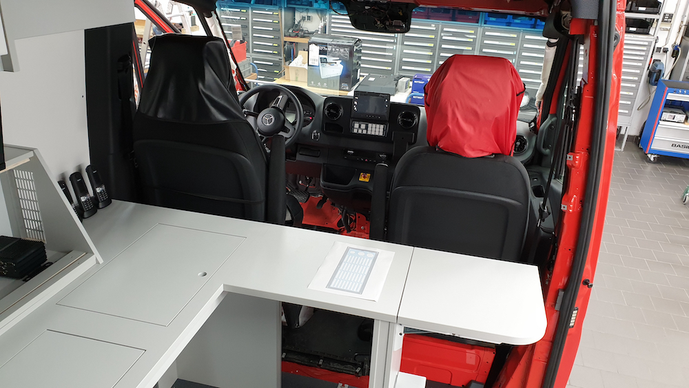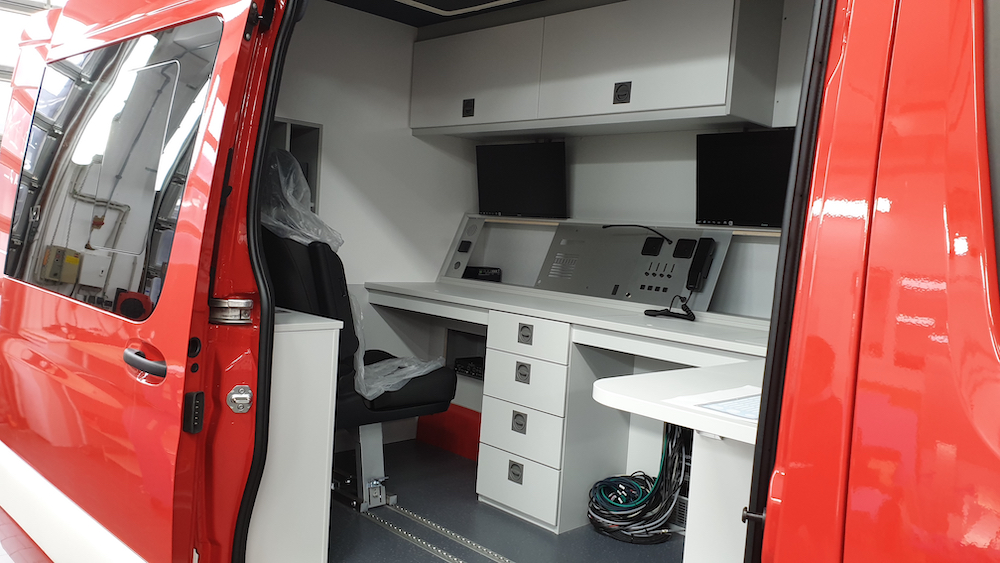 Seit 2016 arbeiteten Kameraden an der Planung und Entwicklung eines passenden Fahrzeugkonzeptes. Dazu wurden zunächst Messen und andere Feuerwehren besucht, um sich Einsatzleitwagen anzusehen. Hier konnten wir reichlich Infos und Erkenntnisse mit auf dem Weg nehmen. Nochmal vielen Dank an die Werkfeuerwehr Symrise in Holzminden und an die Feuerwehr Höxter! Mit all diesen Erkenntnissen und Infos wurde in mehreren Sitzungen ein Leistungsverzeichnis für den neuen ELW der Feuerwehr Steinheim erstellt. Mitte August 2018 wurde das Fahrzeug dann ausgeschrieben. Das Ausschreibungsverfahren hat die Firma Selectric in Münster für sich entschieden. Nach einigen Baubesprechungen wird seit Ende 2018 in Münster das Fahrzeug ausgebaut. Innen bietet der ELW 2(3) vollwertige Funkarbeitsplätze mit dem Funksystem IDECS 2 und den Modulen Kommunikation, Ortung und Dokumentation, moderne Kommunikationstechnik mittels Fax/Internet/VOIP Telefonie, Navigation mittels automatisch aufgespielten GPS Koordinaten, ein Funkmast ausfahrbar auf 6m, die Einsatzleitsoftware Fireboard, ausfahrbare Markiese und noch einiges mehr….