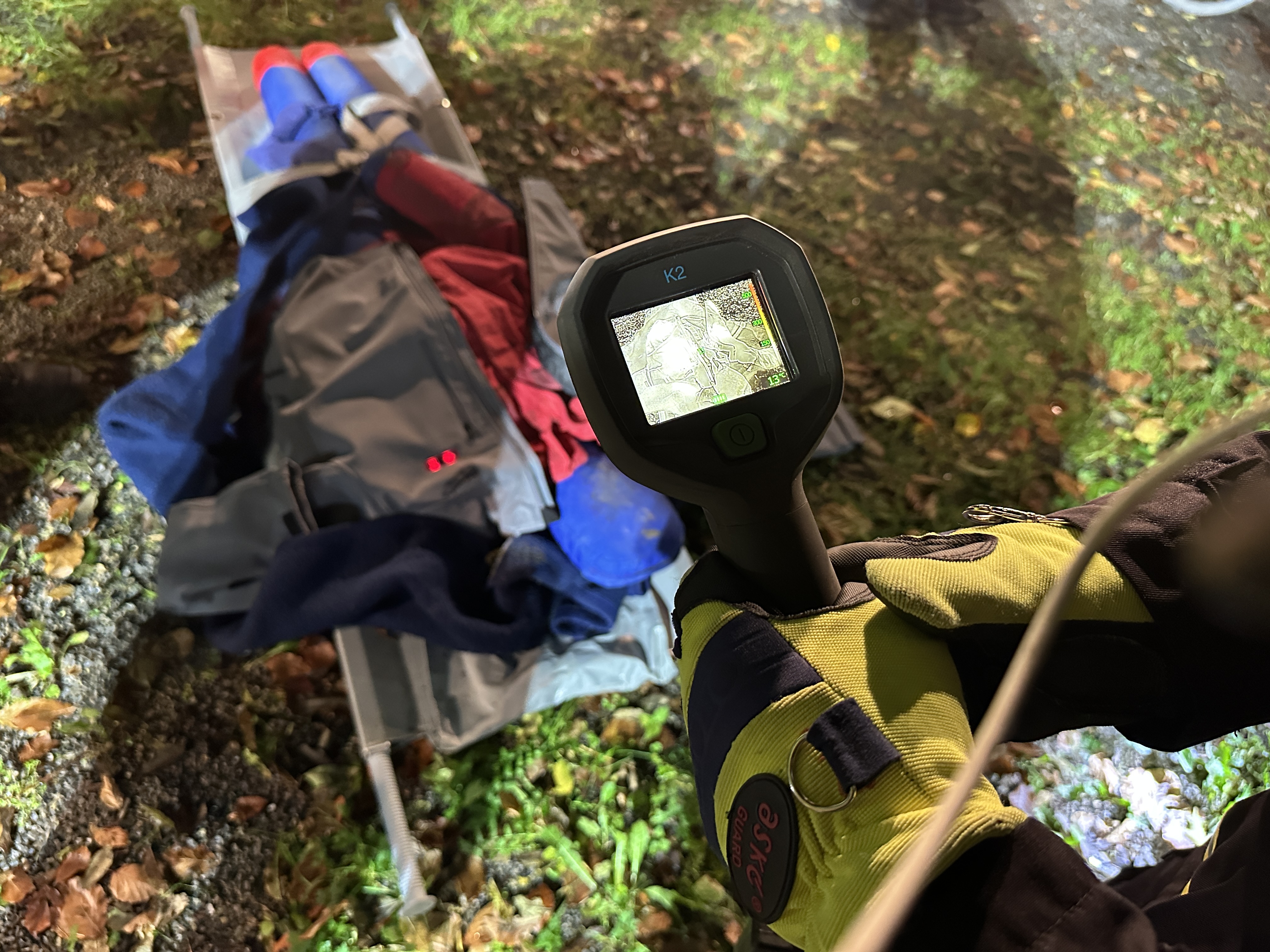Übungsannahme war die Suche nach einer vermissten Person in unwegsamem Waldgelände. Um eine möglichst realistische Einsatzlage zu simulieren, wurde das Gebiet weitläufig abgesucht. Vier Trupps, ausgestattet mit Wärmebildkameras, begaben sich systematisch auf die Suche. Ergänzend kam die Drohnengruppe der Löschgruppe Bergheim zum Einsatz, um das Gelände aus der Luft zu überblicken und gezielt Hinweise auf den Aufenthaltsort der vermissten Person zu finden.