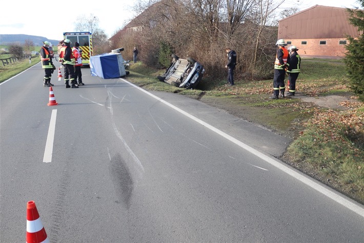 Die Feuerwehr wurde zu einem Verkehrsunfall mit eingeklemmter Person alarmiert. Bei Eintreffen der Einsatzkräfte stellte sich der Unfall als Alleinunfall eines PKWs mit Anhänger heraus, der seitlich in einem Graben lag. Die Person war bereits durch den Rettungsdienst aus dem Fahrzeug befreit worden. Die Feuerwehr musste keine weiteren Massnahmen ergreifen. Alle weiteren anrückenden Kräfte konnten ihre Einsatzfahrt abbrechen. (Foto: POL HX)