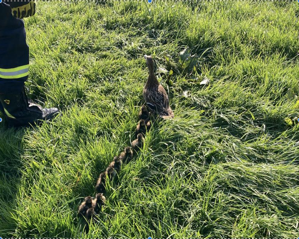 Eine Entenfamilie lief auf einer Landstraße umher. Die Feuerwehr geleitete Entenmtter und Küken zu einem nahegelegenen Bach.