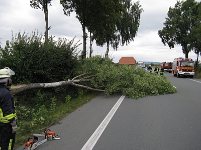 Ein an der Ostwestfalenstrasse (B252) kurz vor der Abfahrt Krankenhasu Steinheim stehender Baum war im unterem Bereich gespalten und drohte auf die Fahrbahn zu stürzen. Durch die Polizei wurde die B252 voll gesperrt und der Baum von der Feuerwehr mit der Motorsäge gefällt und zerteilt.