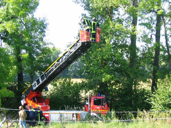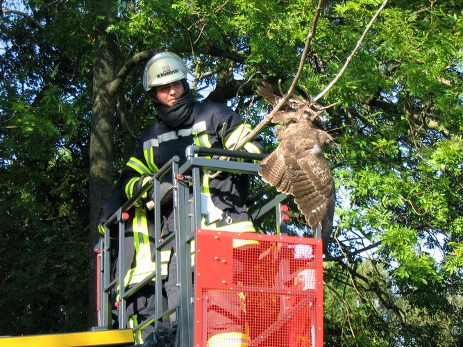 Die Drehleiter wurde zur Unterstützung des Löschzuges Nieheim zu einer Tierrettung in den Sägemühlenweg gerufen. Ein Greifvogel hatte sich in einem Ast in 20 Meter Höhe verfangen. Mit Hilfe der Drehleiter wurde der Greifvogel aus seiner Notlage befreit und anschliessend der Adlerwarte Berlebeck zugeführt.(Bilder: Feuerwehr Nieheim). Weitere Bilder finden Sie bei der Feuerwehr Nieheim.