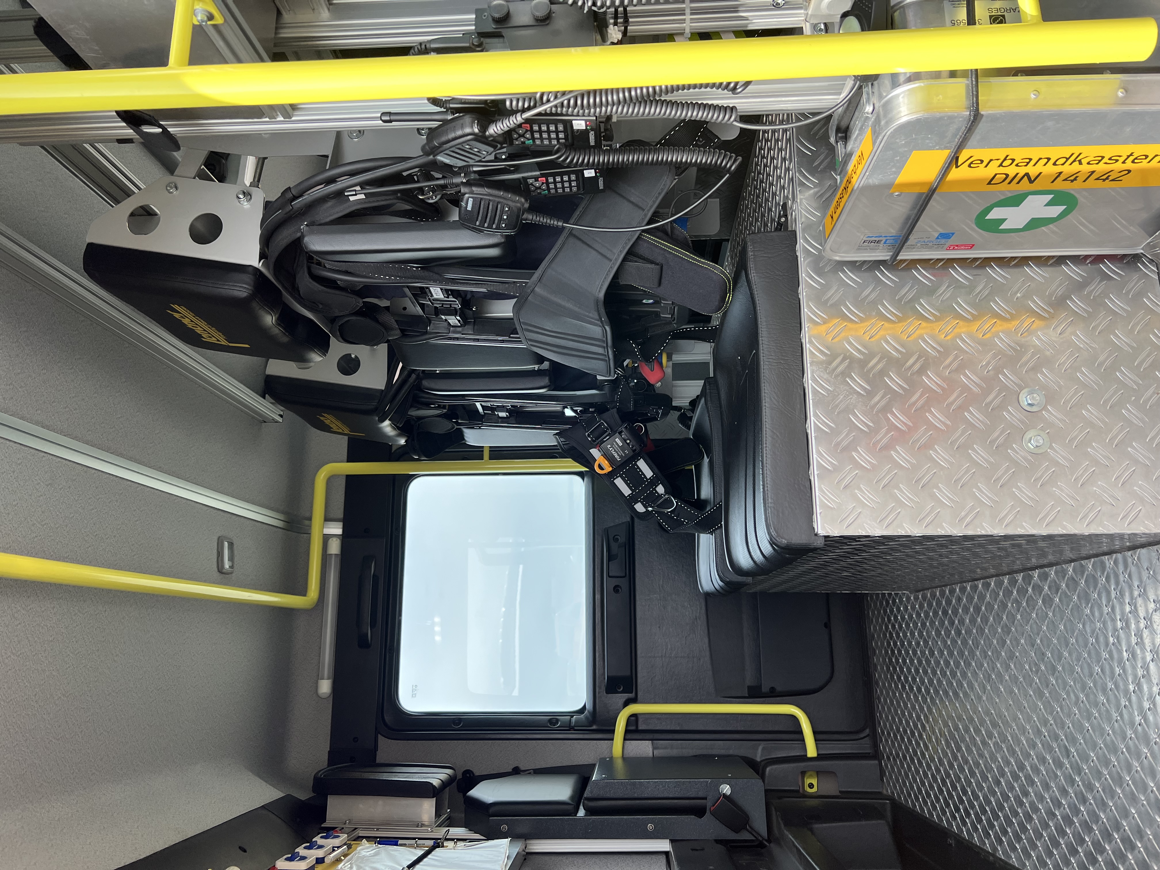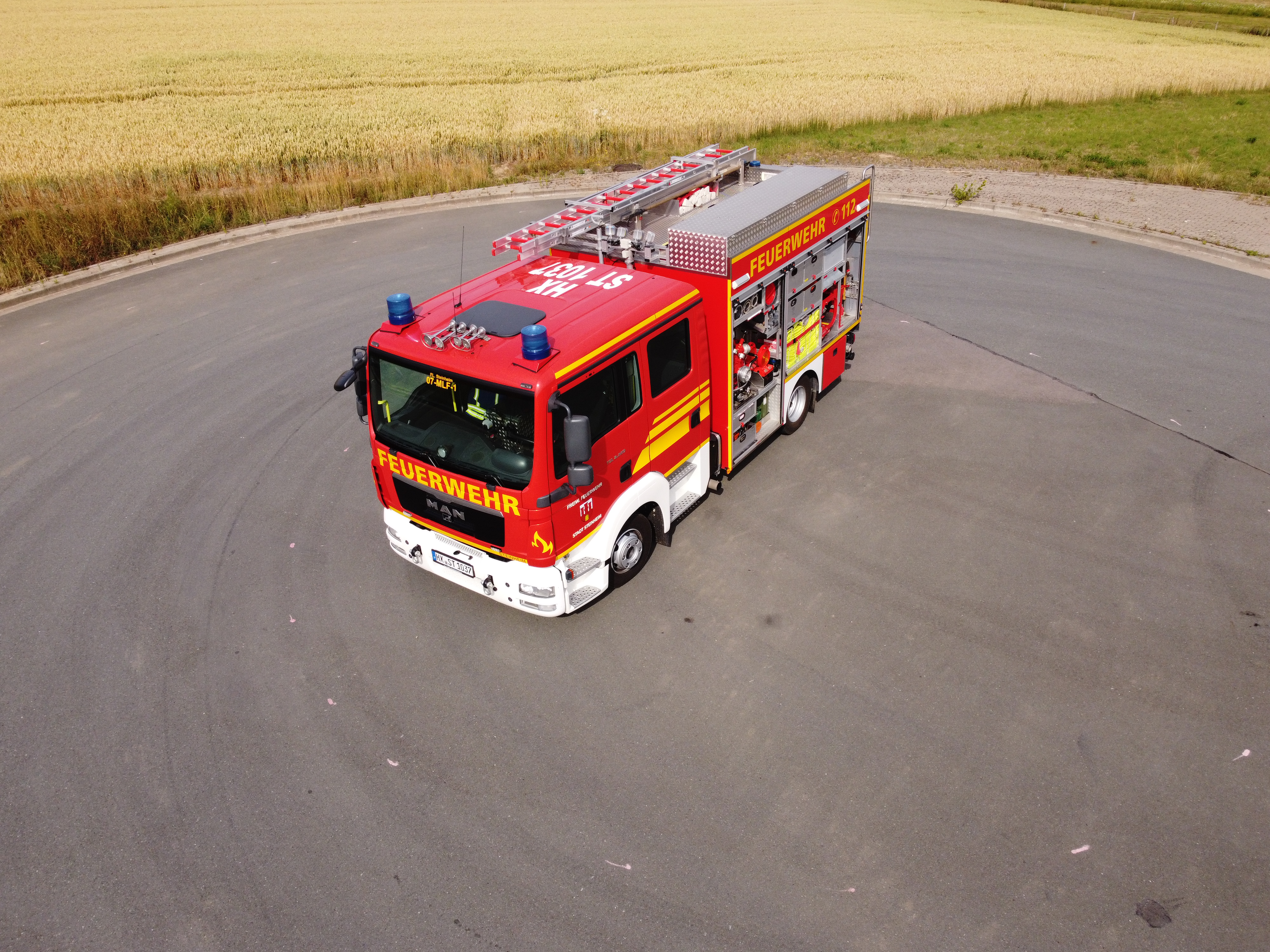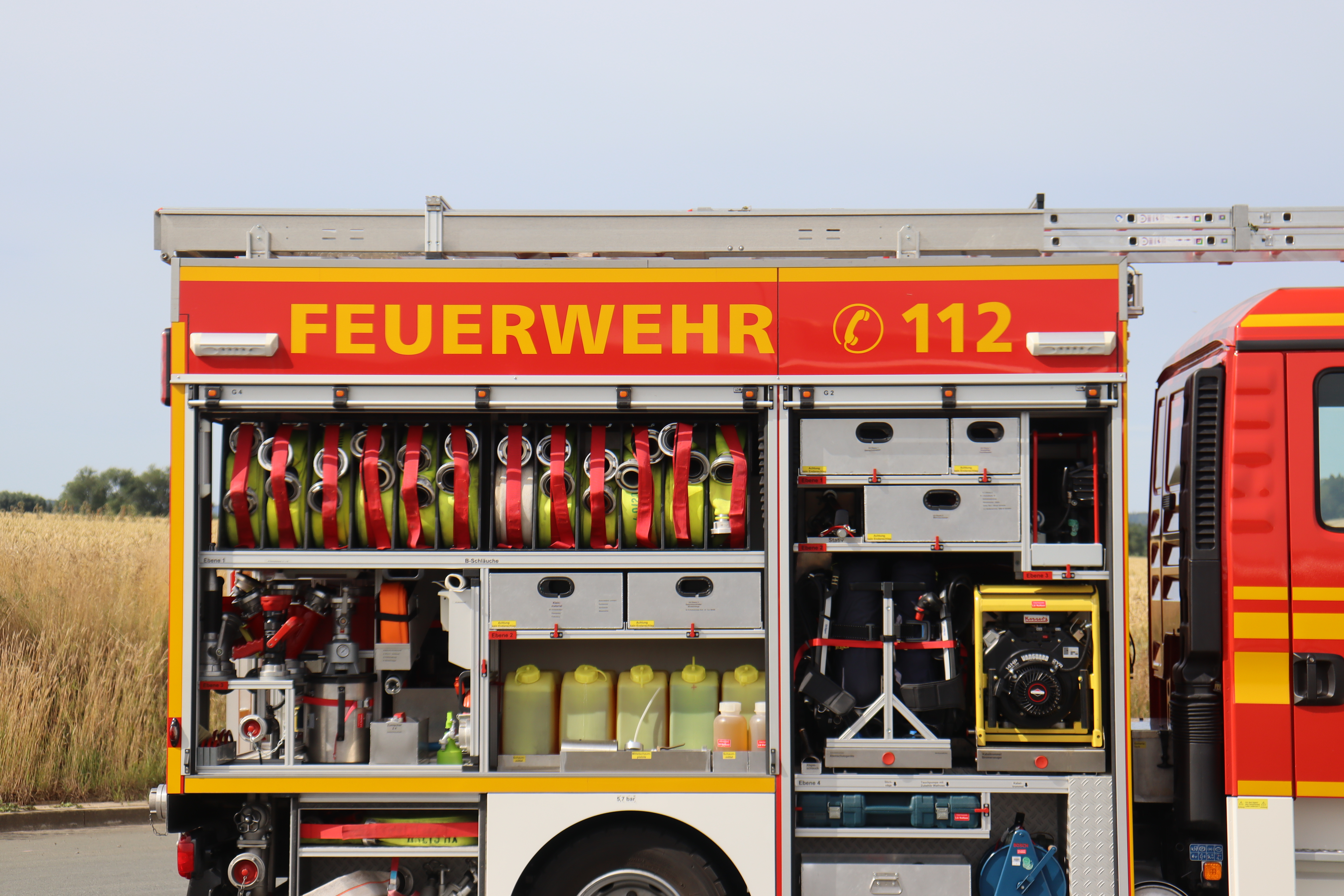 Besondere Beladung: Motorsäge inkl. Schutzkleidung, Wärmebildkamera Flir K2, Tauchpumpe TP 8/1, Schwimmsaugkorb, Umfeldbeleuchtung mit pneumatischen Lichtmast 24V, 2x 1000 Watt Zusatzscheinwerfer, Stromerzeuger 5 kVA, 30m C-Druckschlauch für Schnellangriff, Überdrucklüfter LEADER MT 236 mit Verbrennungsmotor, 1 Kombischaumrohr M4 / S4-B1, 1 Mittelschaumrohr mit 2 Liter Schaummittelbehälter